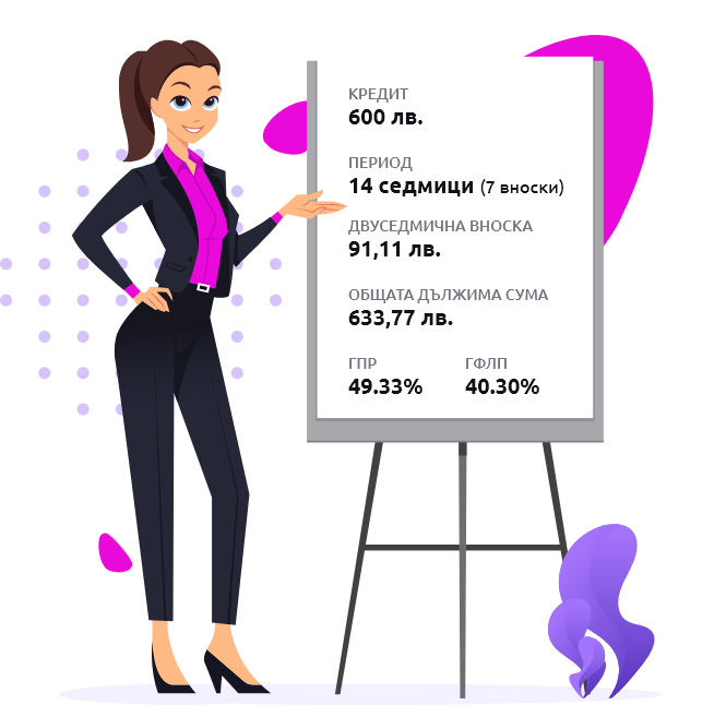 При отпуснат кредит в размер на 600 лв. за период 14 седмици (7 вноски) в случай на коректно изпълнение на всички задължения по договора, двуседмичната Ви вноска ще е 91,11 лв.